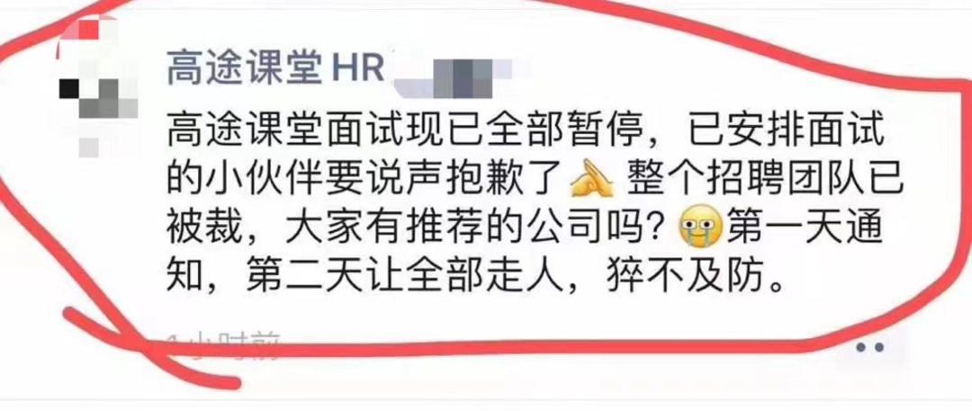 7月2日,国内知名教育机构高途课堂再现裁员风波。该公司HR在个人朋友圈表示,高途课堂的面试全部暂停,招聘团队已经被裁,个人正在寻求新工作。