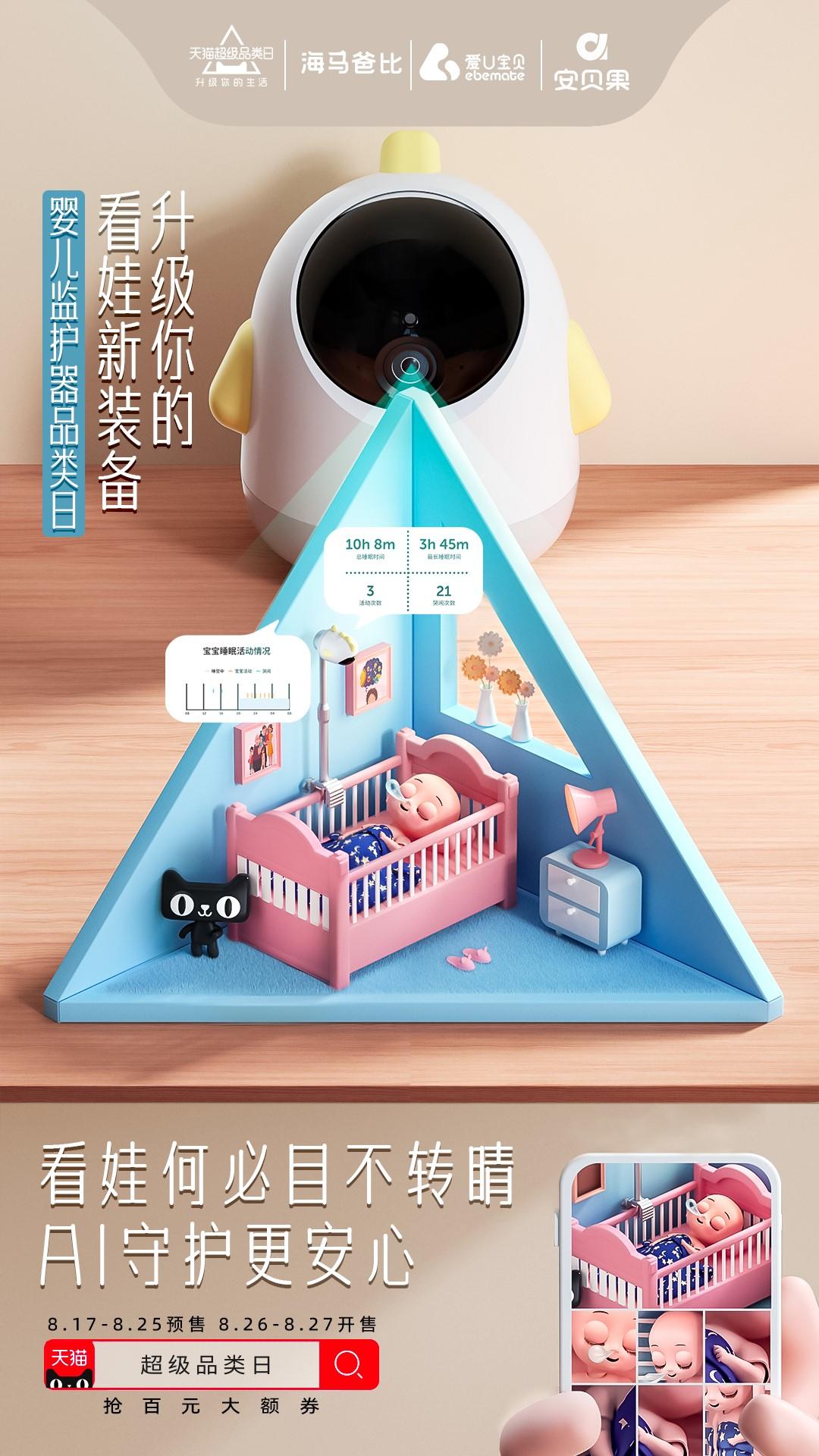 为了提升用户对婴儿监护器品类的认知,天猫超级品类日联合海马爸比、爱U宝贝、安贝果三大婴儿监护器头部商家以“升级你的看娃新装备”为主题,围绕婴儿监护器AI睡眠安全监测、AI智能安抚、AI便捷全彩三大升级趋势与宝爸宝妈们展开沟通。