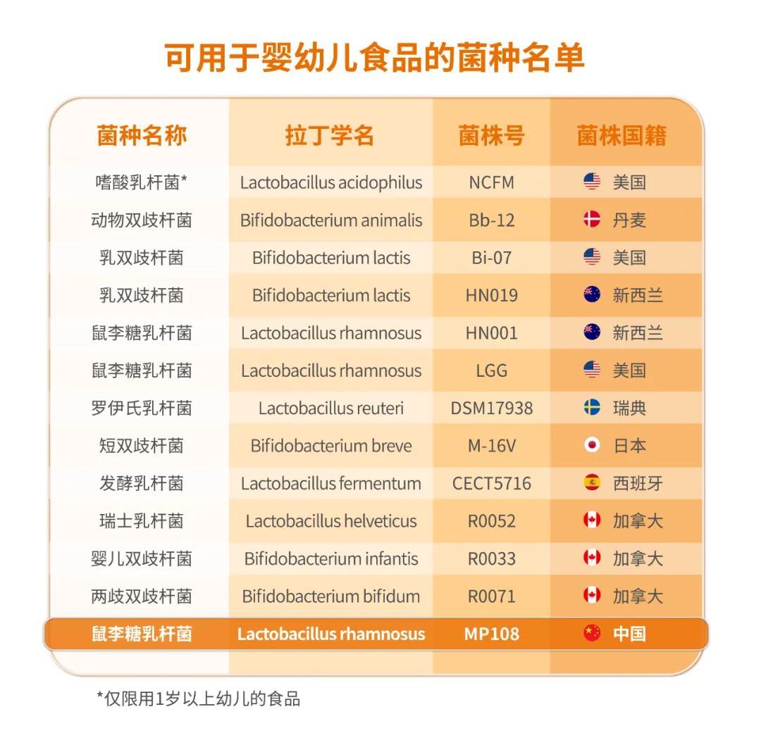 诚然,在婴童益生菌市场高端化、细分化和专业化趋势之下,任何产品的突围都需要有差异化竞争力的加持,而科研创新则是非常关键的一环。爱益森小橙盒独家采用2021年4月澳优旗下益生菌业务品牌锦旗生物获批的中国第一株自主研发菌株——MP108 鼠李糖乳杆菌(Lactobacillus rhamnosus MP108,以下简称:MP108),以中国菌呵护中国肠,并搭配三种益生元,每袋添加 120 亿活菌,增强免疫力,双向调节便秘腹泻,为中国宝宝肠道健康保驾护航。