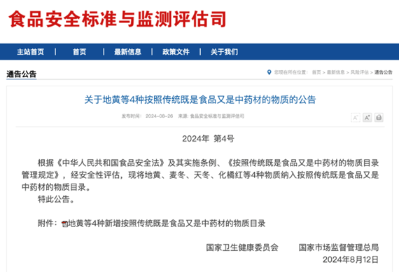 导语:继党参、铁皮石斛、西洋参、杜仲叶等9种物质纳入药食同源目录后,不久前的8月12日,地黄、麦冬、天冬、化橘红也获批加入此名单,截至目前我国药食同源目录内的物质已增至106种。本篇内容,「营养品情报」将为您分享这四种新增物质的相关资讯,与您共探药食同源的未来趋势与商业可能。