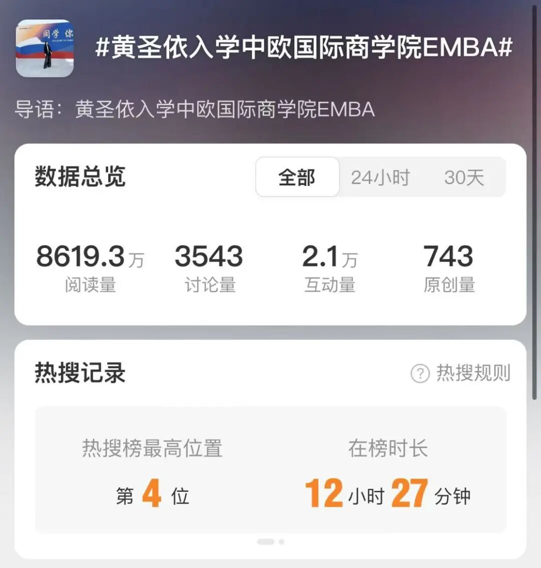 今天周一忙了一天,突然看到黄圣依上了中欧国际商学院EMBA冲上热搜了#黄圣依入学中欧国际商学院EMBA#。我成了黄圣依的师兄,还是比较正宗的师兄都是EMBA,中欧校友比较讲究“辈分”的,给我个人的感受中欧校友互动挺好的。