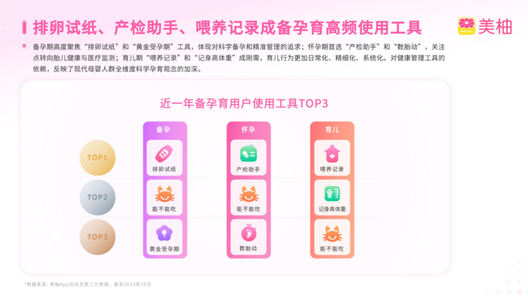 美柚的核心优势源于其无可比拟的用户规模与市场渗透率:累计服务超3亿女性用户,月活用户超5000万、日活稳定超1100万,“10个孕妈妈7个用美柚”的渗透率连续3年攀升,仅今年1-10月便有超500万新生宝宝在美柚降生。从经期到生育的全生命周期高触达率,让美柚沉淀了最具代表性的真实数据,得以精准勾勒中国女性生育现状与需求图景。