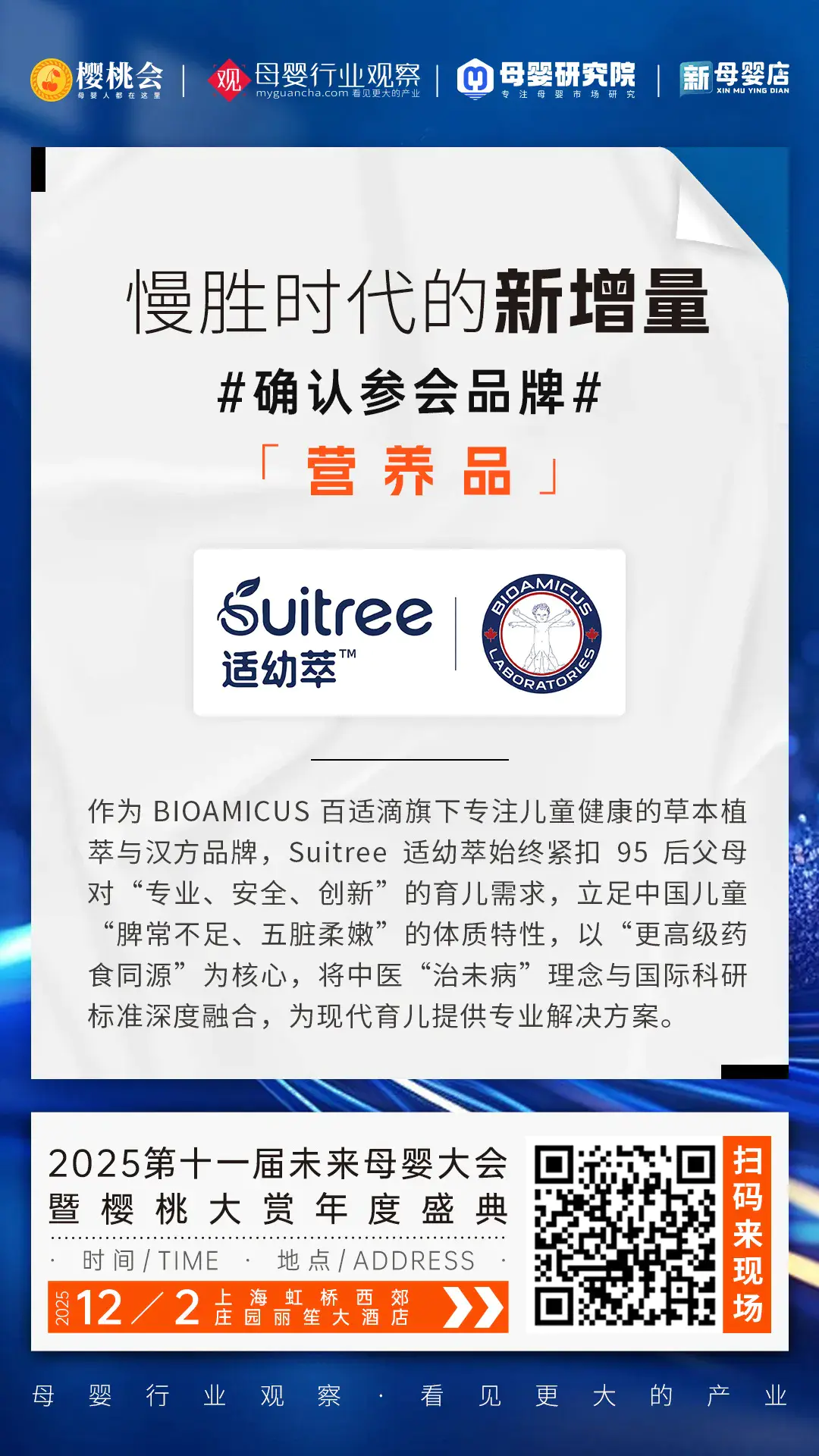 12月2日,上海,由母婴行业观察主办的「慢胜时代的新增量·2025第十一届未来母婴大会暨樱桃大赏年度盛典」高能来袭!引领风向最前沿,下探行业最深度,近百位资深嘉宾将莅临现场,带来顶级的思考启发、资源对接和落地方案。
