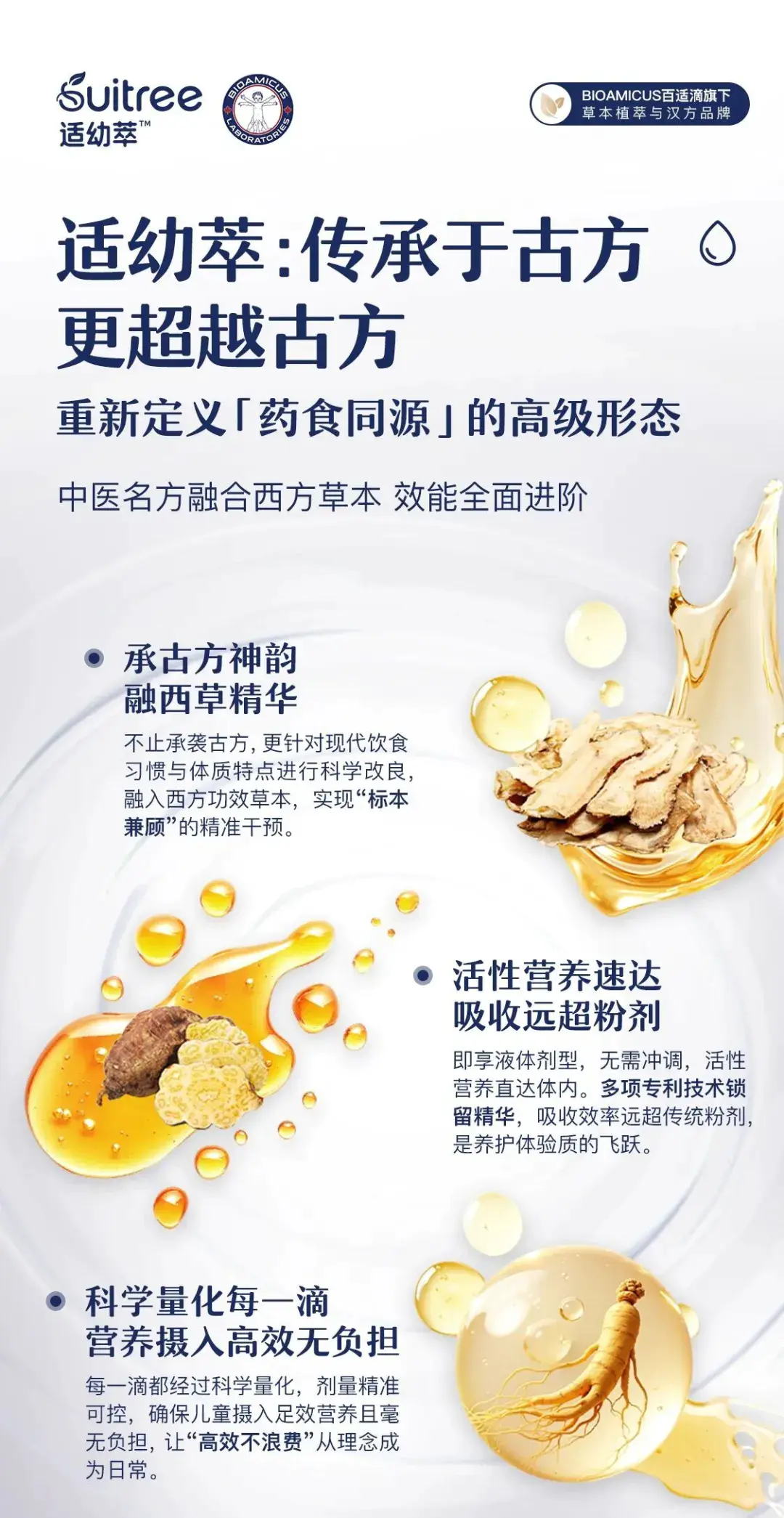 作为BIOAMICUS 百适滴旗下专注儿童健康的草本植萃与汉方品牌,Suitree 适幼萃始终紧扣95后父母对 “专业、安全、创新” 的育儿需求,立足中国儿童 “脾常不足、五脏柔嫩” 的体质特性,以 “更高级药食同源” 为核心,将中医 “治未病” 理念与国际科研标准深度融合,为现代育儿提供专业解决方案。