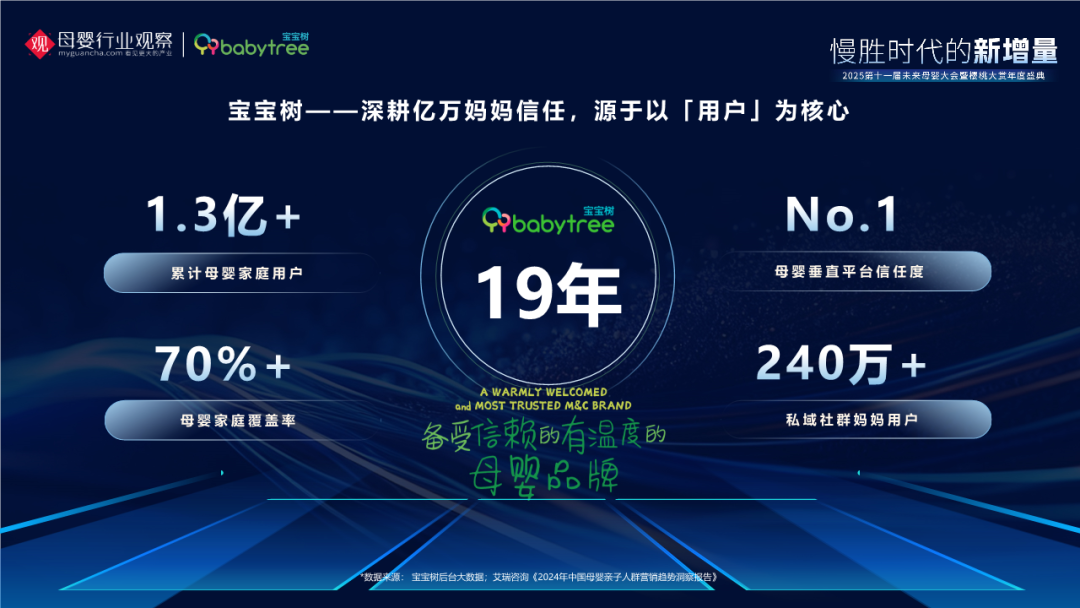 首先,我想先介绍一组宝宝树的核心数据,宝宝树在母婴行业已深耕19年,累计服务1.3亿母婴家庭用户,母婴家庭覆盖率高达70%,在垂直母婴平台中,用户信任度稳居第一。此外,我们还运营着240万妈妈私域社群,这些核心用户资产,正是代表着我们对时代变革的深刻洞察。