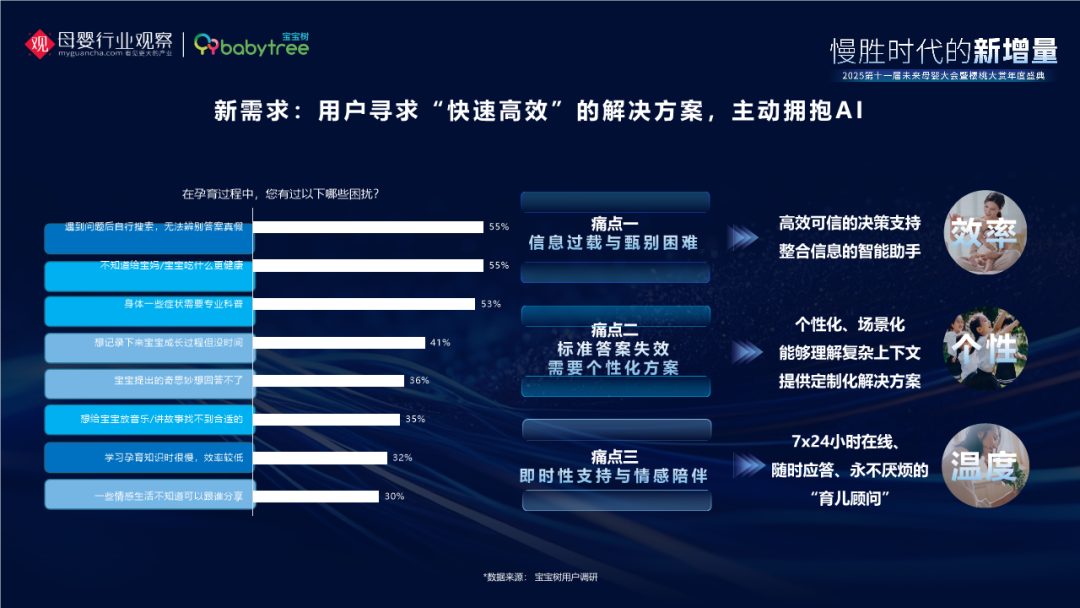 这些变化也带来了新的痛点:一是信息过载与甄别困难,碎片化信息充斥,妈妈们难以快速筛选出对育儿真正有帮助的内容;二是标准答案失效,需要个性化方案。每个宝宝和妈妈都是独特的个体,个性化、场景化,能够理解复杂上下文,提供定制化解决方案变得非常重要;三是即时性支持与情感陪伴,妈妈们需要“7x24小时在线”即时有效的陪护,随时随地找到答案的“育儿顾问”。
