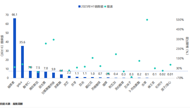 其中,褪黑素以绝对的优势占据成分市场第一的位置,酸枣仁、茯苓、百合等药食同源成分稳定增长,益生菌、甘氨酸螯合镁等“肠脑轴”概念成分增速显著。