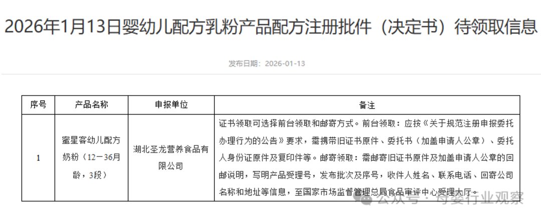1月13日,国家市场监督管理总局食品审评中心发布新一批的婴幼儿配方乳粉产品配方注册批件(决定书)待领取信息,湖北圣龙营养的一款产品获批。