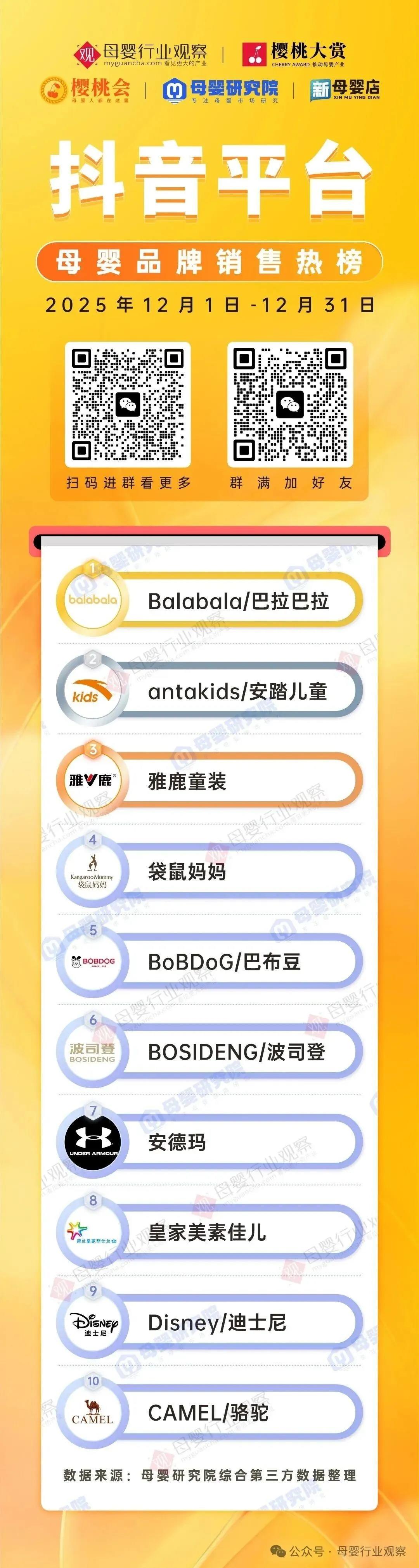 近日,抖音平台12月(2025年)母婴品牌销售热榜出炉,巴拉巴拉、安踏儿童、雅鹿童装、袋鼠妈妈、巴布豆、波司登、安德玛、皇家美素佳儿、迪士尼、骆驼10 大品牌上榜。