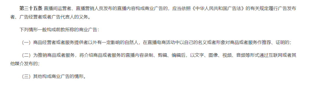 《办法》第三十五条规定,“有一定影响的自然人”的带货行为可能被界定为商业广告,需履行广告代言人义务。