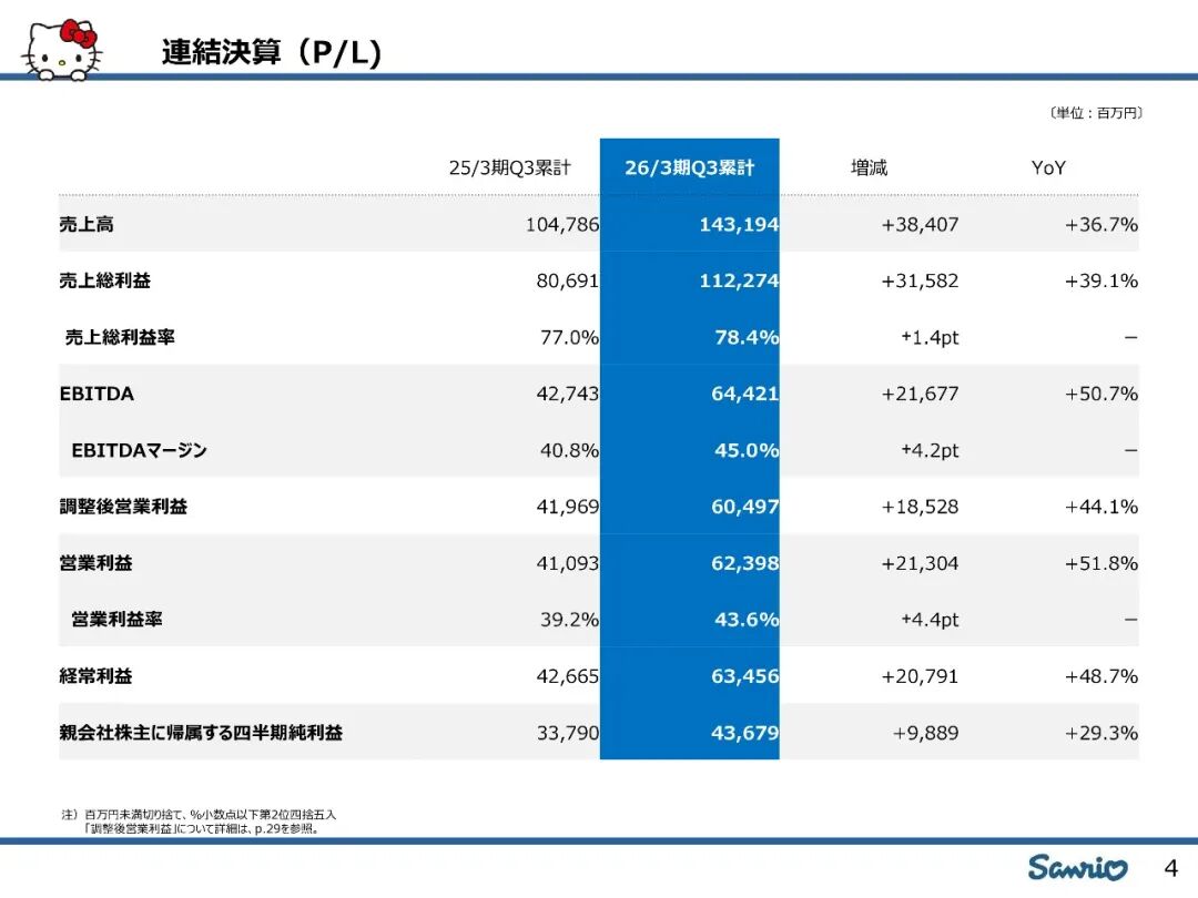 导读:如果可爱有重量,三丽鸥刚刚交出了史上最沉甸甸的一份成绩单。2026年2月,三丽鸥公布了其2026财年第三季度财报。数据显示,年累计销售额达到1431亿日元,约合人民币69亿元,同比增长36.7%;营业利润623亿日元,同比增长51.8%。无论是累计还是单季,均刷新了历史纪录。