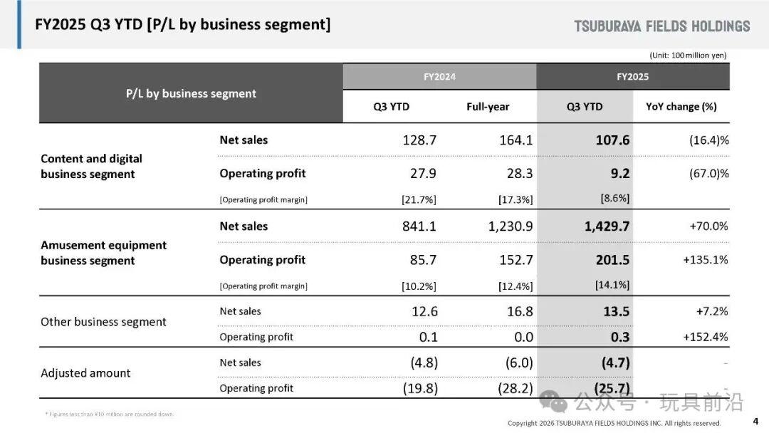 但翻开圆谷的财报,以圆谷制作为核心,涵盖奥特曼IP的授权、商品销售、影像及活动收入的内容与数字业务板块,前三季度销售额为107.6亿日元,同比下降16.4%;营业利润9.2亿日元,同比暴跌67%。这一数字乍看令人担忧,但细拆结构,问题集中出在单一市场——中国。