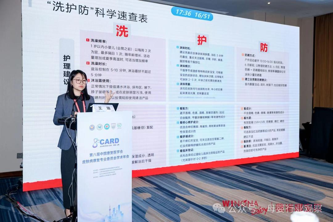 另外,首都医科大学附属北京儿童医院马琳教授在演讲《从科学体系到临床实证:高质量发展婴童皮肤“洗护防”科学体系》中强调,“儿童皮肤屏障尚未发育完善,湿疹问题频发,精简护肤不是‘减法’,而是‘精准加法’。”她认为,只有摒弃冗余部分,聚焦“洗护防”核心需求,才能真正守护婴童皮肤健康。