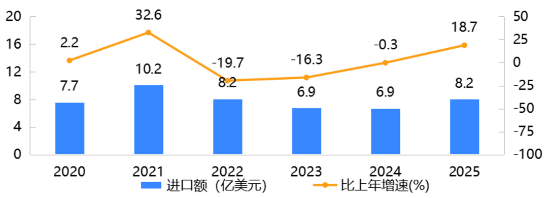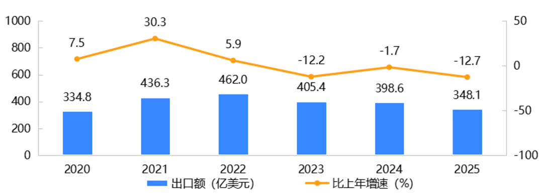 2025年,中国玩具(不含游戏)出口额为348.1亿美元,比上年下降12.7%,比2020年增长4.0%;中国玩具(不含游戏)进口额比上年增长18.7%,近四年首次回升。