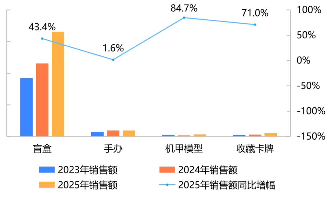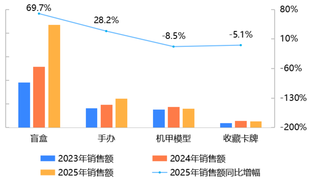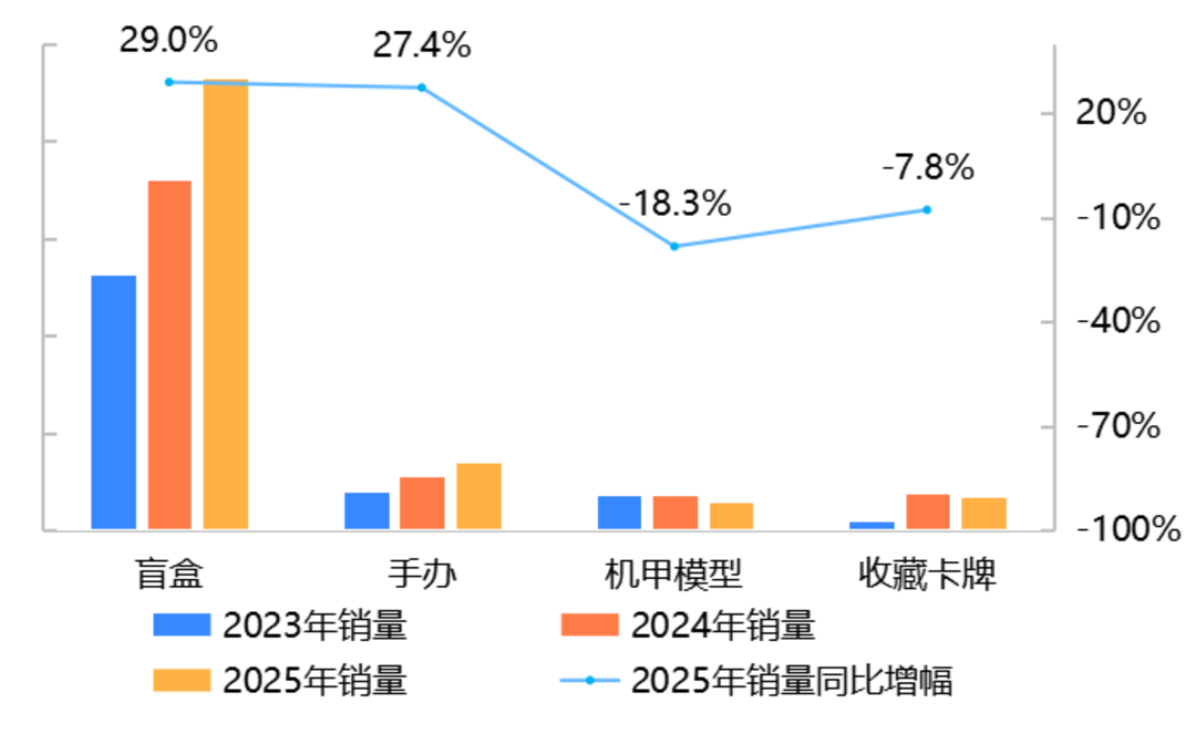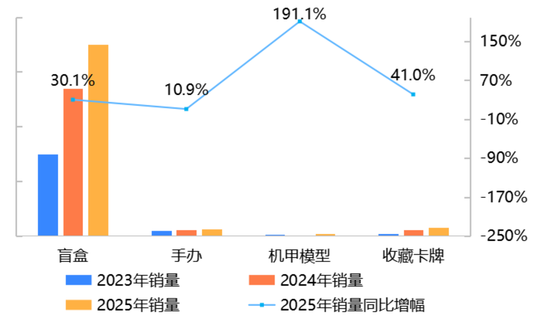 销量:天猫平台盲盒、手办比上年增长,增幅分别为29.0%和27.4%;抖音平台盲盒比上年增长30.1%。