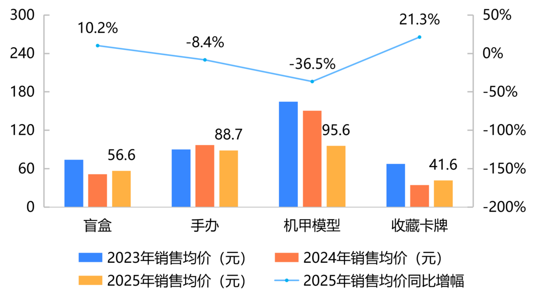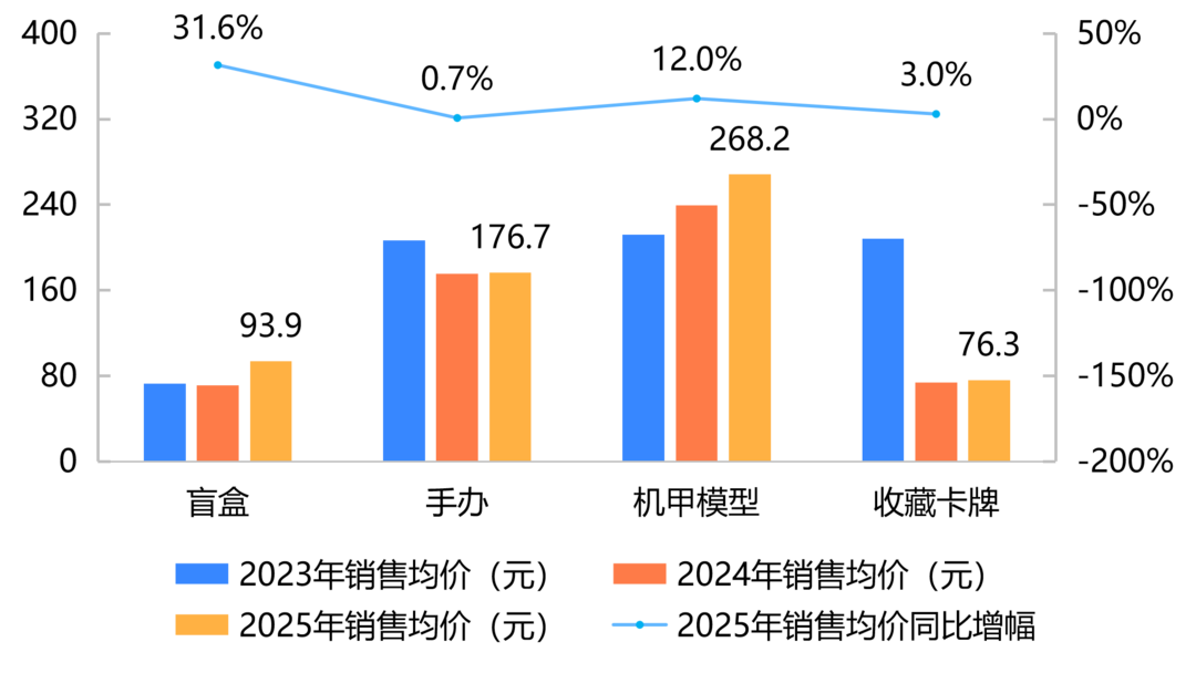 销售均价:天猫平台4个主要品类比上年均增长,其中,盲盒增幅最大,为31.6%;抖音平台机甲模型降幅最大,为36.5%。