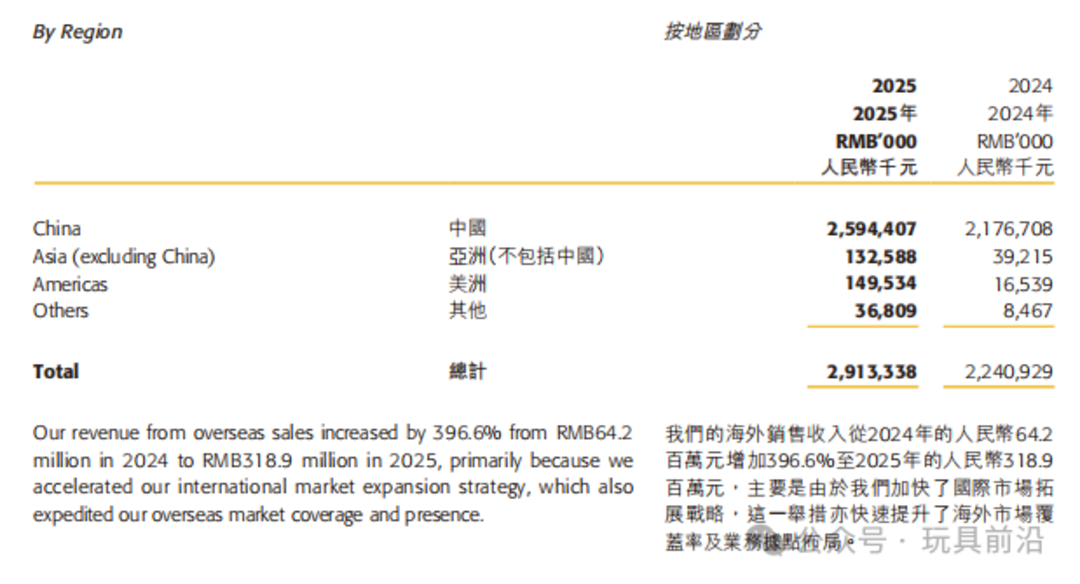 收入结构方面,拼搭角色类玩具贡献了超过28亿元的营收,占比接近98%,产品根基依旧稳固。11月推出的积木车新品类在两个月内录得4000余万元收入,初步验证了品类延伸的逻辑。海外市场则构成最大的增量变量,全年收入3.19亿元,同比增长近4倍,美洲区域增速更是超过800%。与此同时,公司全年投放超过900个新SKU,在售品类总数突破1400个,高频上新策略直接推动了收入曲线的持续上扬。