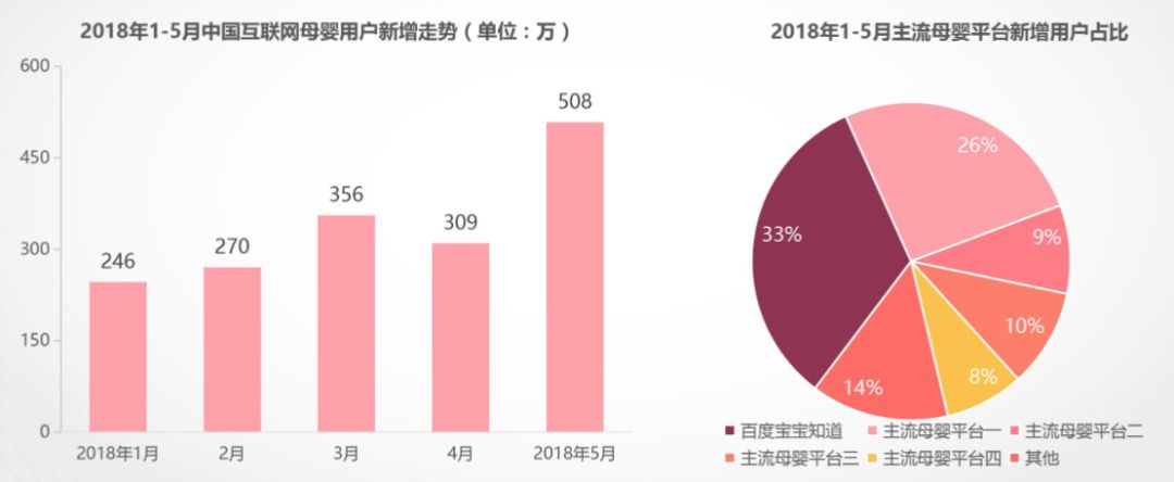 2018年1月-5月,在包含PC端、WAP端及APP渠道的三端流量中,中国互联网母婴用户净增超过一千万,宝宝知道拿到了33%的市场份额。