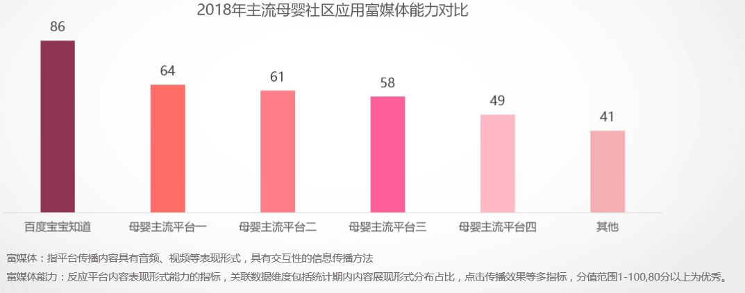 富媒体建设方面,第三方数据显示,宝宝知道排名第一,富媒体化达到了86%,领先于其他的竞品平台。