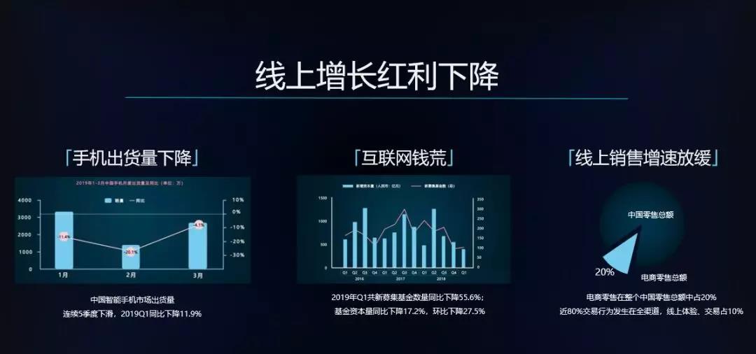 首先看一些趋势,1、手机的出货量在下降,入口的红利已经消失了。2、互联网钱荒,去年上市的互联网企业包括今年上市的互联网独角兽们其实也都不好过,意味着互联网平台的促销或者补贴的力度,以及能拿到的免费流量在消失。3、线上销售速度的放缓。