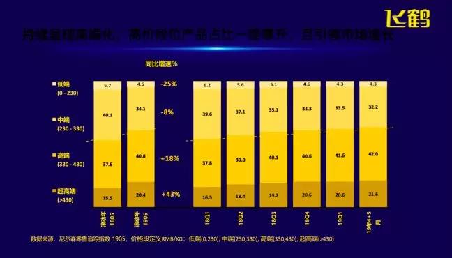 另外,在2019年对于国产奶粉和外资奶粉应该会有这样一个分水岭,十年砥砺前行,国产的奶粉有可能会超过外资。另外持续呈现高端化,高价格段位产品占比一路攀升,并且能够引领市场的增长。大家可以看到超高端已经在21.6%,高端在42%,中端实际上在逐步下滑,低端产品将会越来越少。所以基于以上的数据,中国的婴儿奶粉来讲我觉得在今年会取得重大的突破。