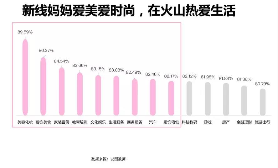 基于对火山母婴用户的洞察,我们会发现火山用户更关注什么?以新线妈妈为例,她们会关注美容化妆、餐饮美食、家装百货、教育培训,这以上四大类是我们非常需要关注的品类。