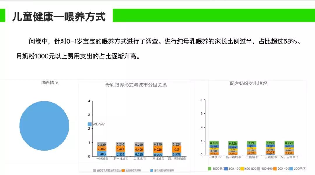 为了不断挖掘用户的需求,近期我们发布了《中国家长对于儿童健康服务的态度及行为数据报告》,其中我们发现,家长最关心儿童生长发育,其次就是心理健康;同时,在喂养方式上,0到1岁的孩子进行母乳喂养的比例在逐年提升;此外,辅食呈现出比较明显的过早添加的趋势等。