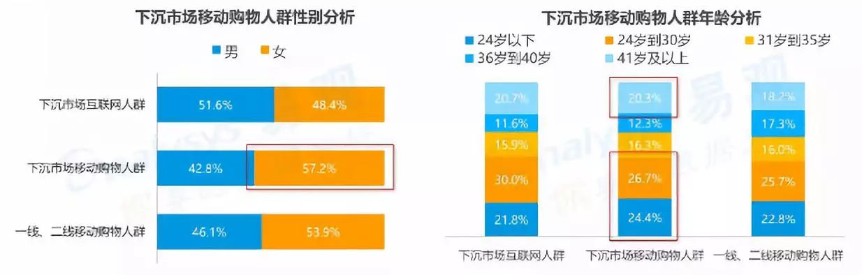 从性别看,下沉市场互联网总体人群女性占比为48.4%,其中移动购物人群女性占比57.2%,高于一、二线城市移动购物人群女性占比。可见下沉市场移动购物女性化趋势明显。