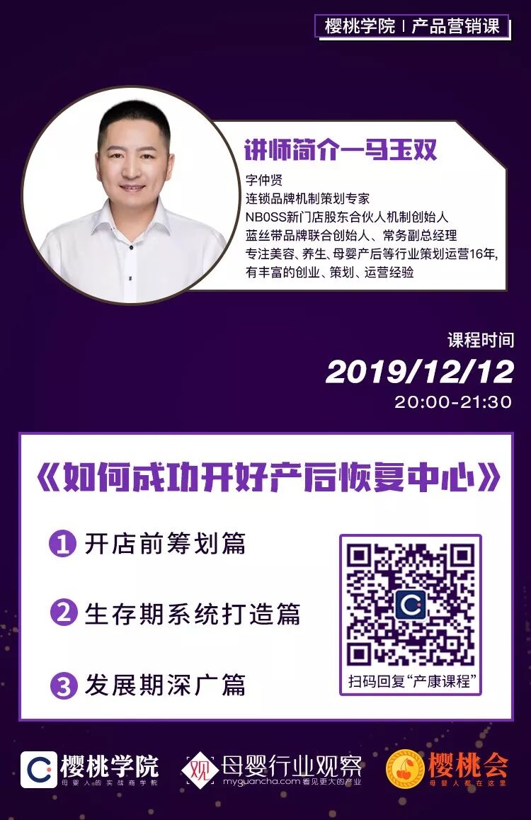 对于一个产后恢复中心来说,开店需要做哪些筹划呢?在门店运营的过程中,又有哪些需要注意的关键事项呢?樱桃学院特邀蓝丝带品牌联合创始人&常务副总经理——马玉双于下周四(12月12日)为大家带来《如何成功开好产后恢复中心》课程。
