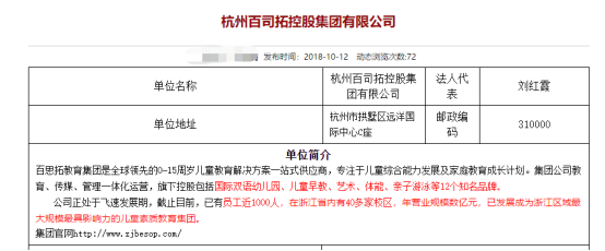 在2018年招聘信息显示,杭州百司拓控股集团有限公司是针对 0-15 周岁儿童教育解决方案一站式供应商,专注于儿童综合能力发展及家庭教育成长计划。集团公司教育、传媒、管理一体化运营,并注册拥有百思拓品牌,资料显示员工1000多人,在浙江省内有40多家校区。公司旗下控股包括国际双语幼儿园、儿童早教、艺术、体能、亲子游泳等多达12个品牌。