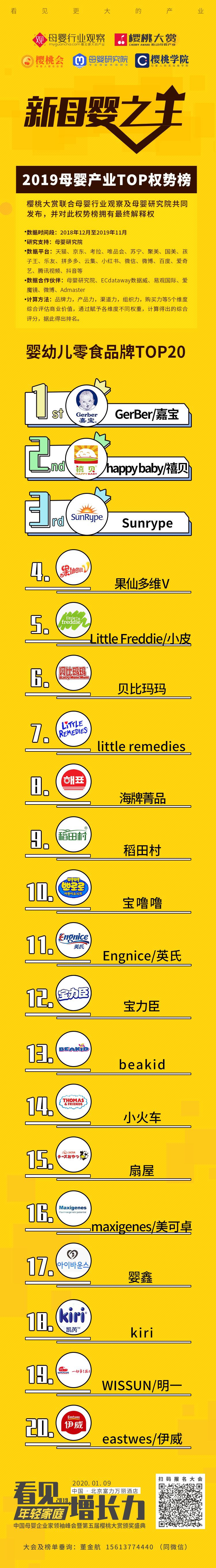 导读:岁末将至,年货必不可少,而零食绝对是年货的主角之一,商务部发布的《消费升级背景下零食行业发展报告》称:中国人一年吃掉2万亿零食超,过了全国一半省(市)的全省GDP。直白的巨额数字引起一众网友自黑式调侃:只有在这里,我才能找到存在感,毕竟两亿有我股份。其中零食也是中国儿童常消费中的一项重要的支出,随着偏低龄化的儿童零食的需求在不断增多,未来婴幼儿零食市场大有可为。今日,母婴行业观察联合专注母婴市场研究的母婴研究院,发布了2019年婴幼儿零食权势榜TOP20。榜单主要通过对各个奶粉品牌的品牌力、产品力、渠道力、组织力、购买力5个维度综合评估商业价值,通过赋予各维度不同权重,计算得出的综合评分,据此得出排名。以下是具体排名:随着90后、95后妈妈群体向母婴消费市场大肆涌入,新生代家庭对与下一代养护的重视程度越来提高,持续增长的母婴市场规模和不断细化的母婴市场需求,为母婴企业的发展带来了前所未有的历史机遇。在消费升级和精细化喂养观念的推动下,消费者投入了更多关注给自己的孩子,尤其针对婴幼儿食品,消费者愿意投入更多费用。其中。其中作为刚起步的小品类,偏低龄化的儿童零食的需求在不断增多,成为线上线下增量之一,成为婴幼儿食品市场的新机会。但从榜单来看,目前婴幼儿零食中还是进口品牌占主导地位。从品牌来看,母婴研究院显示,嘉宝不仅仅保持着线上辅食第一,在零食品类中也保持着第一的地位,销售额遥遥领先,当然这也与它的价格定位有关,主要定位中高端品牌,嘉宝近两百个商品中,均价不超过80元。另外禧贝、Sunrype、小皮等品牌也有不俗的销量。值得一提的是禧贝,产品均价达到126元,且增速也较快。可见消费者更看重零食品牌的影响力,对于价格敏感度逐渐降低。另外也可以看出,在婴儿零食市场整体还处于低价渗透阶段,但高端化崛起趋势较明显,如嘉宝定位中高端发展较快;主打有机的小皮、禧贝高速增长......数据显示,有机早已不再是婴幼儿食品里的新鲜概念,在消费者端,有机概念逐渐与天然无污染等观点挂钩。英敏特在一份针对 2000 多名中国妈妈的调研中也显示,大部分妈妈均给自己的孩子购买过有机婴幼儿配方奶粉。在婴幼儿辅食领域,有机升级更为明显。持续的宣传教育都旨在于进一步提升“有机”概念在辅食市场的认知程度。有机开始由奶粉扩展至整个婴幼儿食品品类。但当下关于婴幼儿零食的界定,无论市场还是消费者都还不清晰,目前最缺的是更为严格的食品认定标准,让孩子吃得开心更吃得放心。