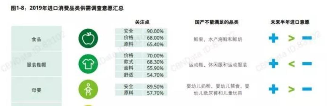 随着新生代父母的逐渐崛起,他们在力挺国产奶粉的同时,也会继续关注进口奶粉,在商务部2019年7月发布的《主要消费品需求状况统计调查分析报告》中就曾显示,消费者认为母婴品类中,婴幼儿奶粉、婴幼儿辅食、婴幼儿纸尿裤和儿童玩具的供给方和消费者增加进口意愿均强于减少进口意愿,这些细分品类是国产品牌不能满足的品类。