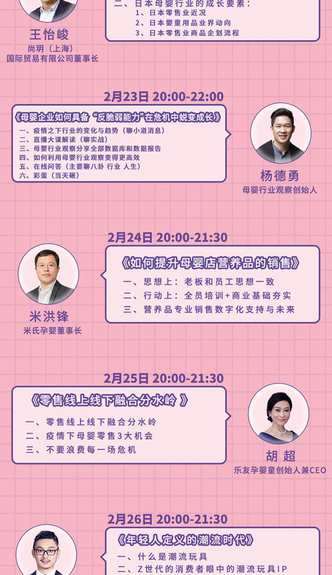 为了更好的应对随时可能出现的挑战,母婴行业观察开启以“母婴企业如何具备反脆弱能力,在危机中蜕变成长”为主题的系列线上公益大课,将邀请100+身经百战的企业家、行业专家等在线分享,共同探讨自救策略、增长路径和未来趋势,助力母婴人成功打响逆袭战。疫情之下,让我们一起主动求变,拥抱不确定性,建立成长型思维,逆风突围。系列课全部收入将用于樱桃公益,樱桃公益专注全球母婴人的公益基金。
