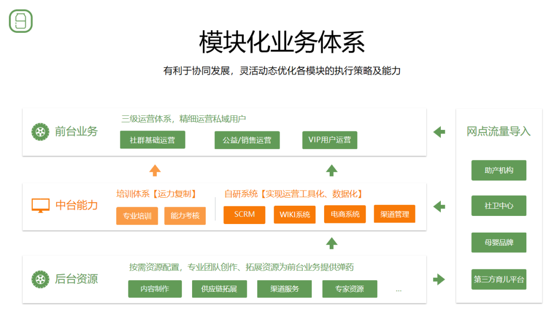 我们整个模块化业务体系分为三部分,首先是前台业务,通过社群基础运营、公益/销售运营、VIP用户运营,进行精细化运营私域用户。后台资源包括内容制作、供应链拓展、渠道服务、专家资源等。最后我们会通过中台能力将后台资源的专业团队创作、拓展资源为前台业务提供弹药,实行有效的转化。