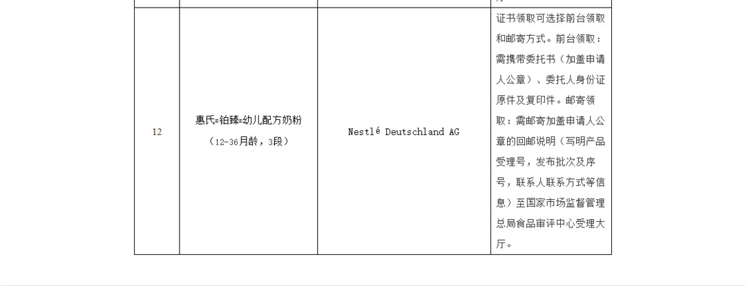 2月6日,国家市场监督管理总局食品审评中心发布婴幼儿配方乳粉产品配方注册批件(决定书)待领取信息单,涉及12款产品,详情如下。(国家市场监督管理总局食品审评中心)