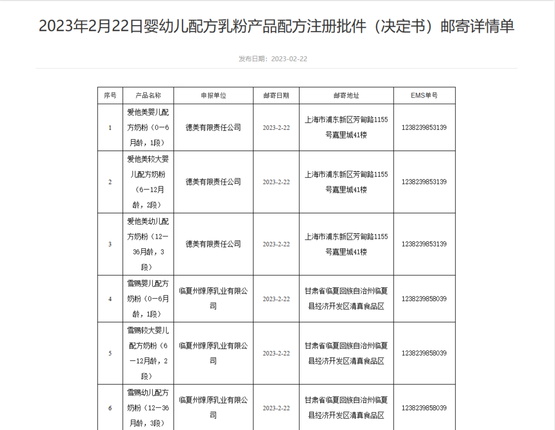 2月22日,国家市场监督管理总局食品审评中心发布婴幼儿配方乳粉产品配方注册批件(决定书)邮寄详情单,涉及9款产品,详情如下。(国家市场监督管理总局食品审评中心)