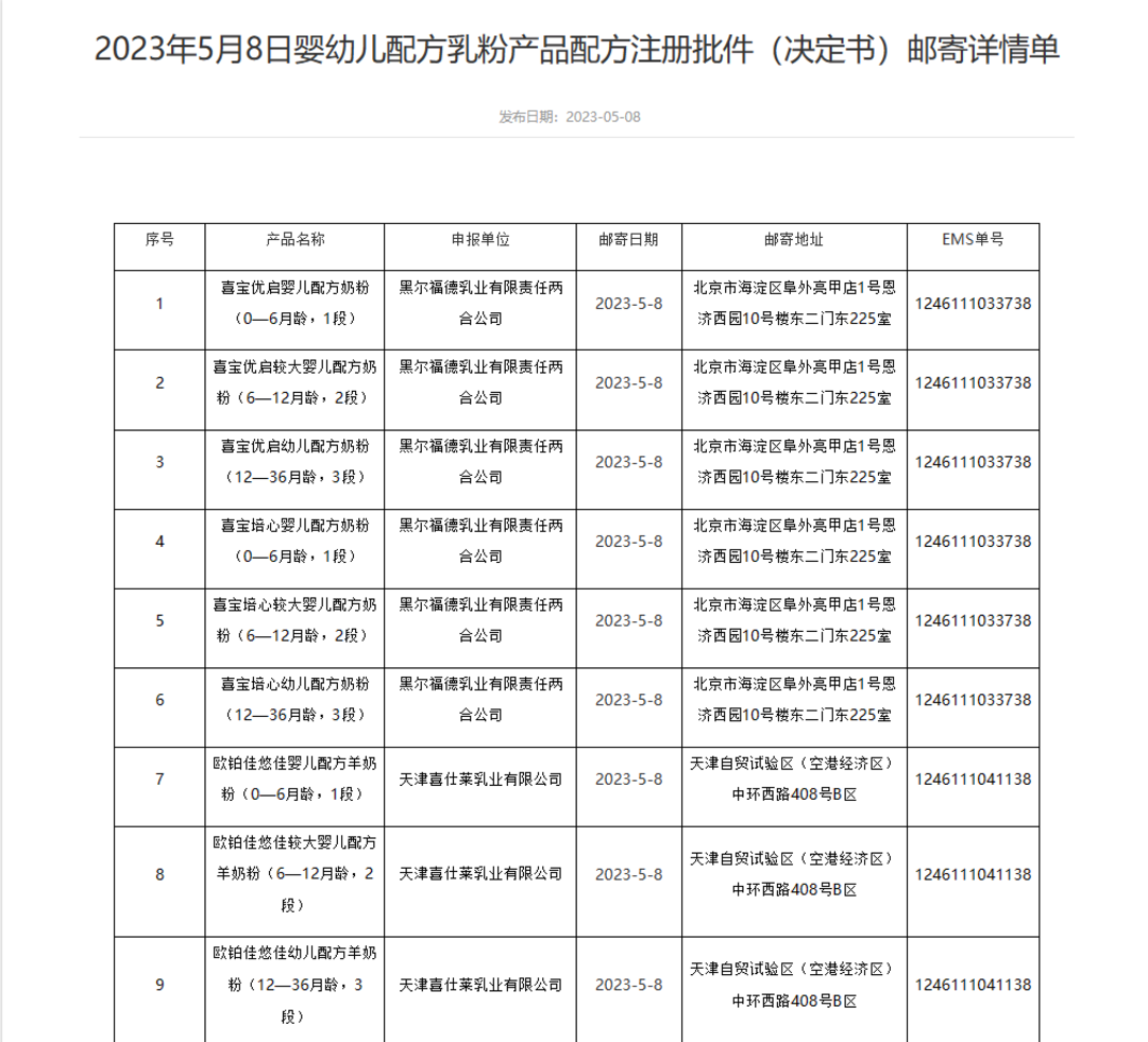 5月8日,国家市场监督管理总局食品审评中心发布婴幼儿配方乳粉产品配方注册批件(决定书)邮寄详情单,涉及21款产品,详情如下。(国家市场监督管理总局食品审评中心)
