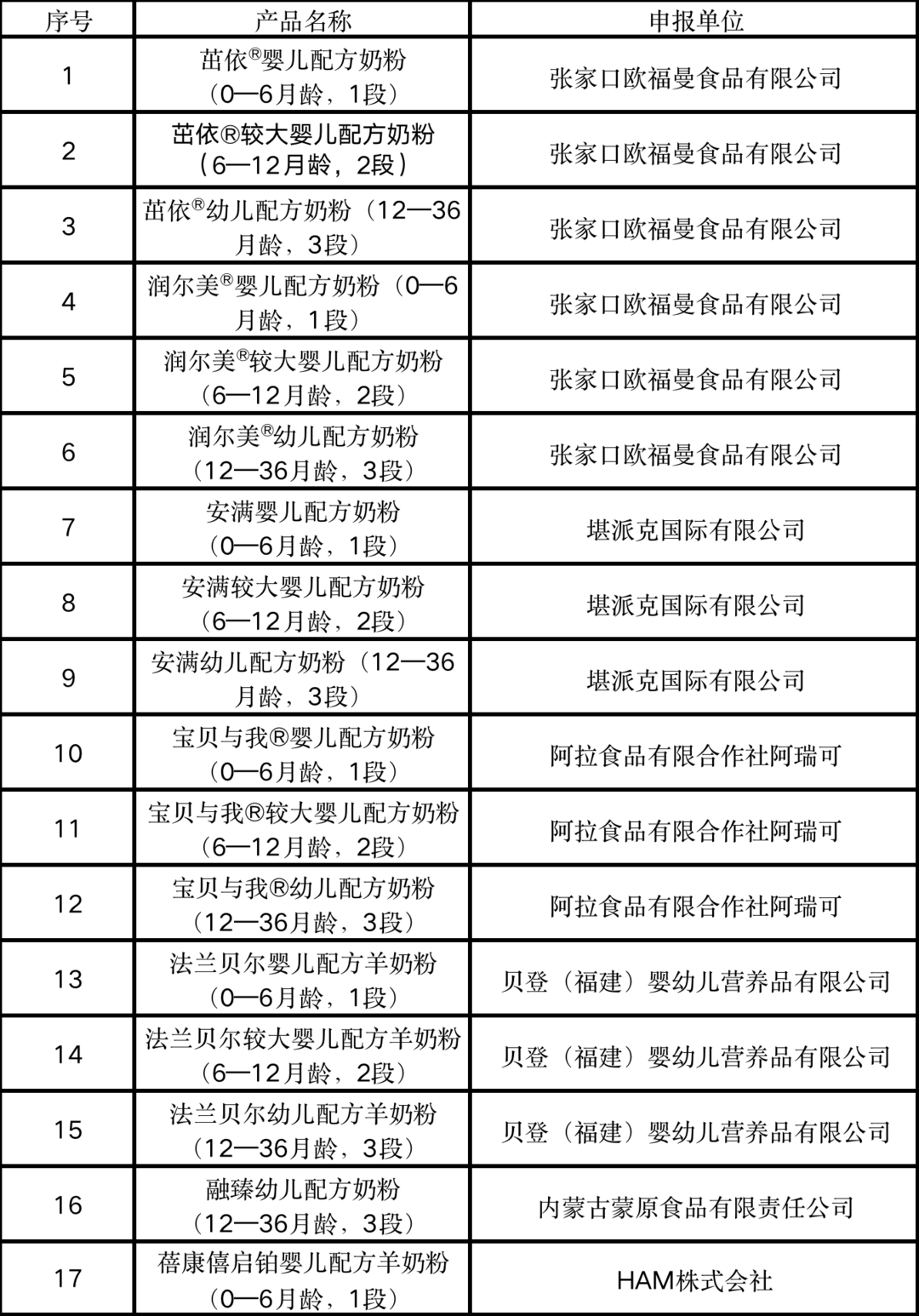 12月21日,国家市场监督管理总局食品审评中心发布婴幼儿配方乳粉产品配方注册批件(决定书)待领取信息,涉及17款产品,详情如下。(国家市场监督管理总局食品审评中心)