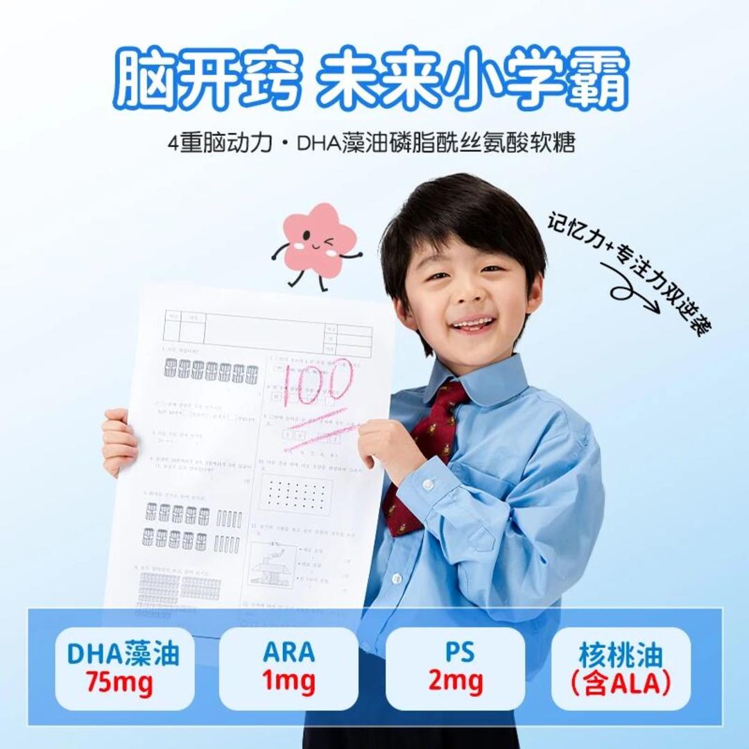 DHA、ARA、PS(磷脂酰丝氨酸)和ALA被称为“脑黄金组合”,优卡丹DHA藻油磷脂酰丝氨酸软糖每粒含75mg DHA藻油+2mg PS+1mg ARA+ALA核桃油,4重脑动力孩子记忆力和专注力双逆袭,在学习和生活中更加得心应手,轻松开启学霸模式。