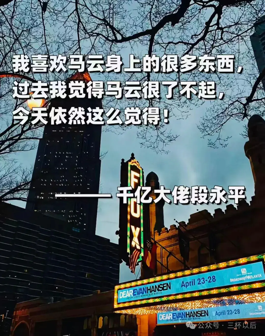 看到我喜欢的段永平评价我更喜欢的马云,感受是相当的好,原来喜欢的都是一类人,大家所见略同,感受也是相似的。