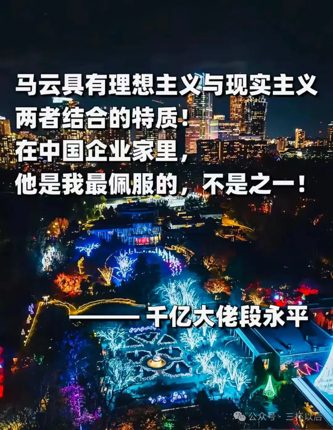 段永平说:“我喜欢马云身上的很多东西,过去我觉得马云很了不起,今天依然这么觉得。”