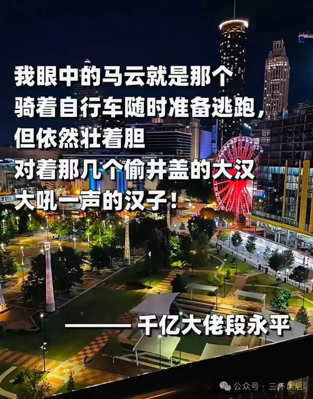 “我眼中的马云就是那个骑着自行车随时准备逃跑,但依然壮着胆对着那几个偷井盖的大汉大吼一声的汉子。”