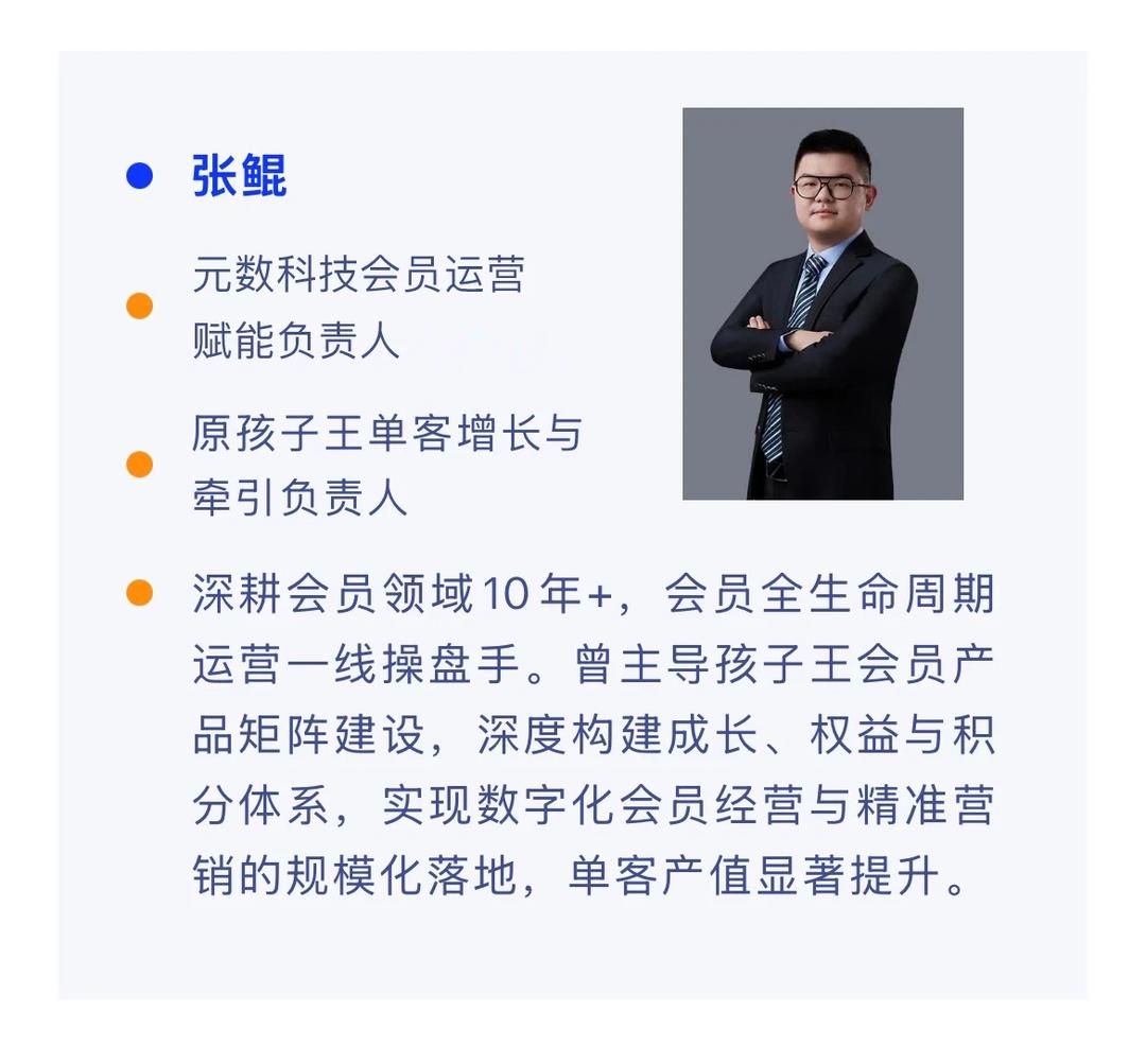 讲师:张鲲-元数科技会员运营赋能负责人原孩子王单客增长与牵引负责人