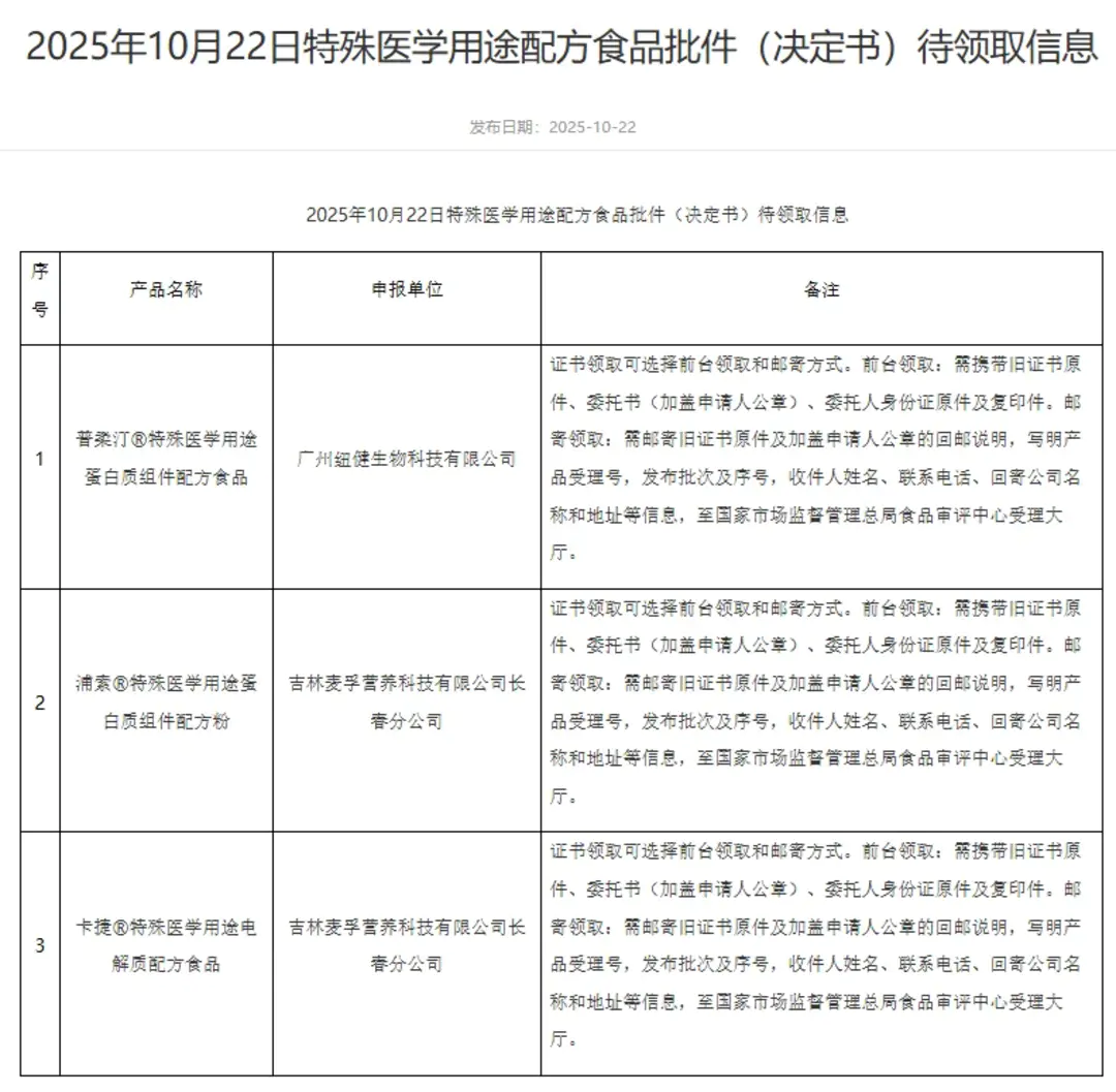 10月22日,国家市场监督管理总局食品审评中心发布新一批特殊医学用途配方食品批件(决定书)待领取信息,涉及纽健生物、麦孚营养科技2家企业的3款产品。