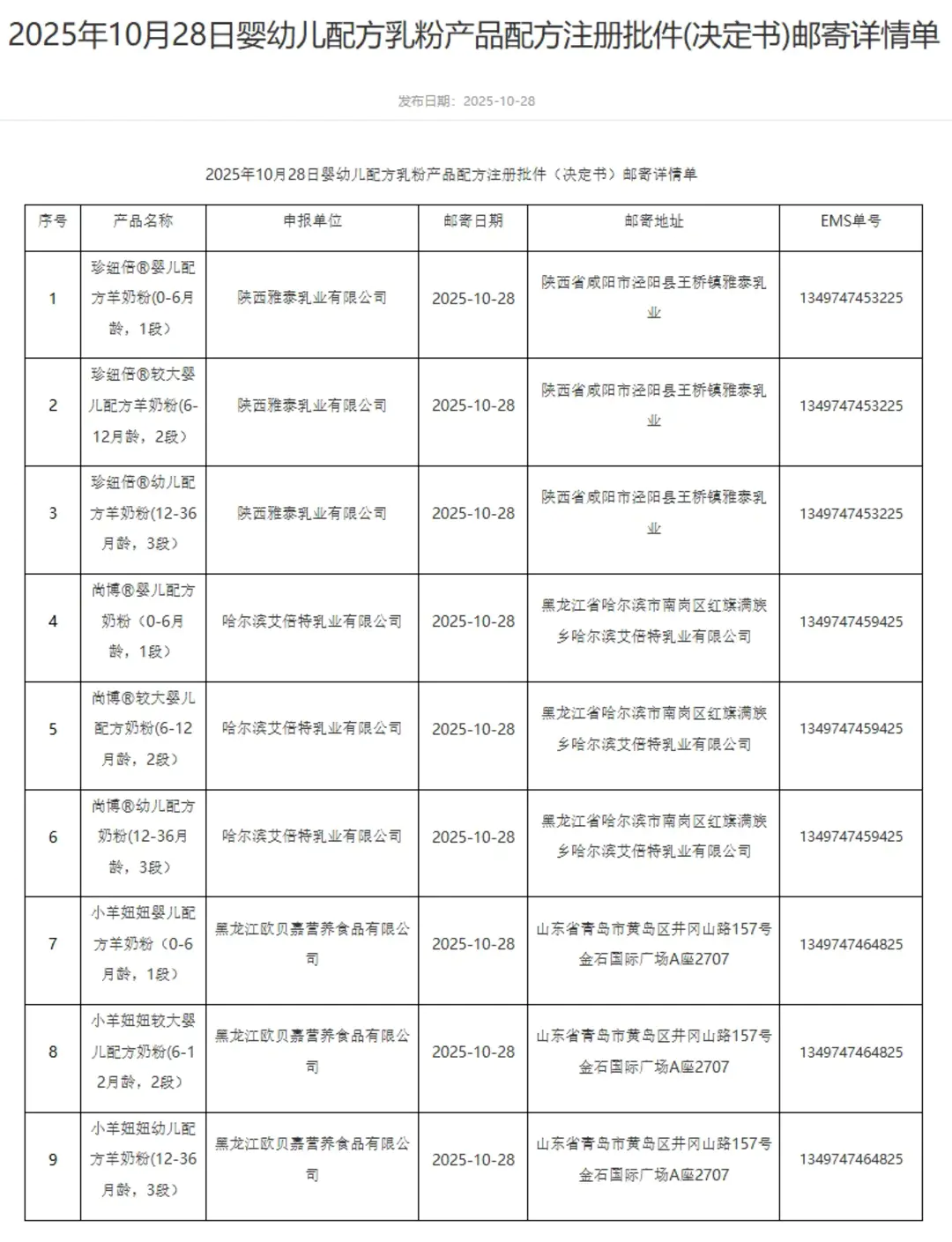 10月28日,国家市场监督管理总局食品审评中心发布新一批婴幼儿配方乳粉产品配方注册批件(决定书)邮寄详情单,涉及雅泰、圣元(旗下哈尔滨艾倍特乳业有限公司)、宜品(旗下黑龙江欧贝嘉营养食品有限公司)等企业的3个系列(珍纽倍、尚博、小羊妞妞)共9款产品。