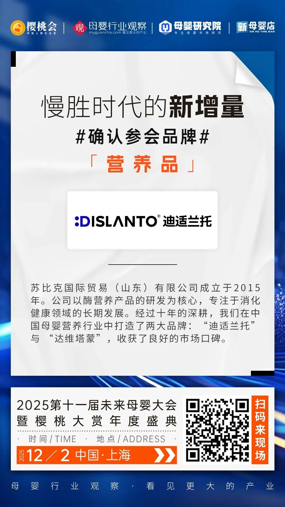 市场格局正在重塑,专业价值愈发凸显。迪适兰托将如何进一步拓宽酶营养的认知边界,带来哪些前沿的科研突破与创新产品?其持续升级的渠道赋能体系,又将如何为行业伙伴打开新的增长空间?期待「迪适兰托」在「慢胜时代的新增量·2025第十一届未来母婴大会暨樱桃大赏年度盛典」(点此报名)上的精彩亮相!