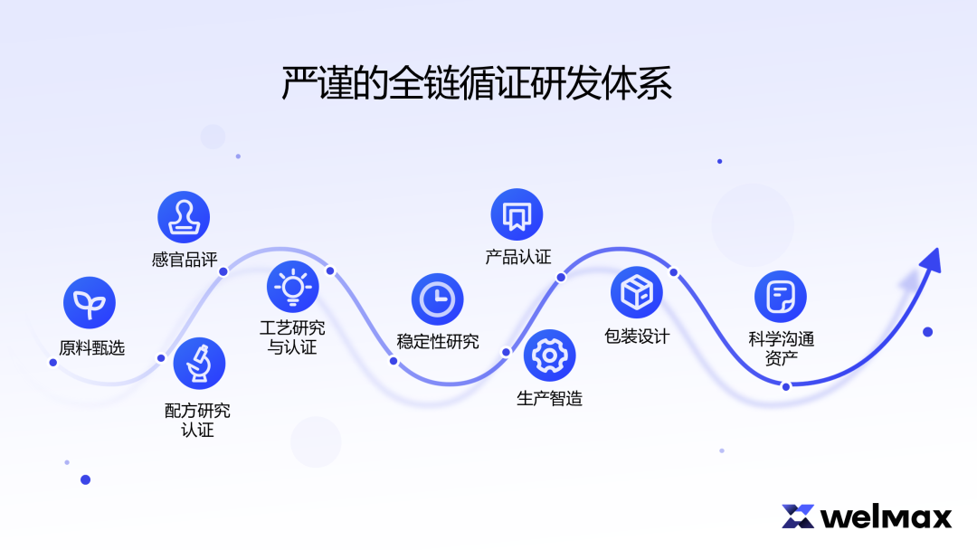WELMAX®循证营养技术平台以前沿的科学理念为指导,建立起从原料筛选到市场转化的完整产业链。在研发端,平台基于全球优质原料与创新成分研究,构建起科学严谨的配方体系,并依托专业感官评价与工艺中试验证,确保产品在口感与稳定性上达到理想状态。通过系统开展稳定性研究与智能化生产管控,平台进一步实现从实验室到规模化生产的顺畅转化,并为产品生产效率与品质安全提供可靠保障。