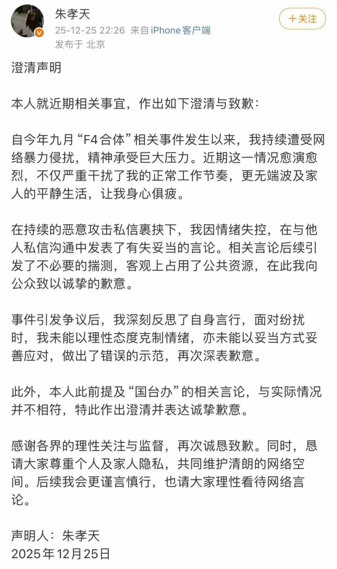 你做什么决定当然你自己说了算,我也不是很关注朱孝天F4什么的,只是最近事情真的热闹,破天的富贵,你打的这么烂,而且反手举报往死里整人家,真的是把事情做绝了。如果我身边有朱孝天这样的人,很吓人。他不是活得通透,是敏感,情绪不稳定,小肚鸡肠,看不得别人好。