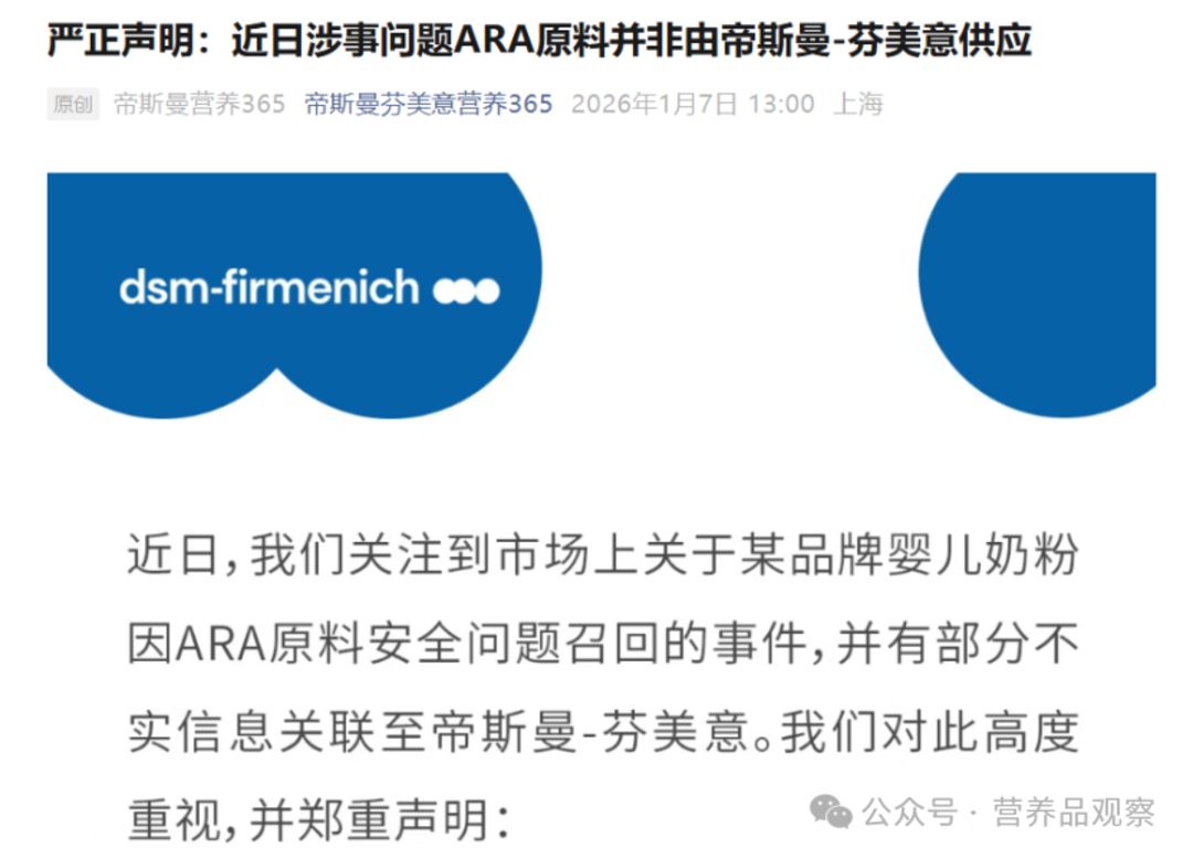 作为全球ARA市场头部供应商的帝斯曼-芬美意第一时间进行了回应,明确声明涉事原料非其供应,同时透露自家ARA原料需求激增,正全力协调产能保供。一场行业风波,竟意外成了这家企业的“品质证明”。