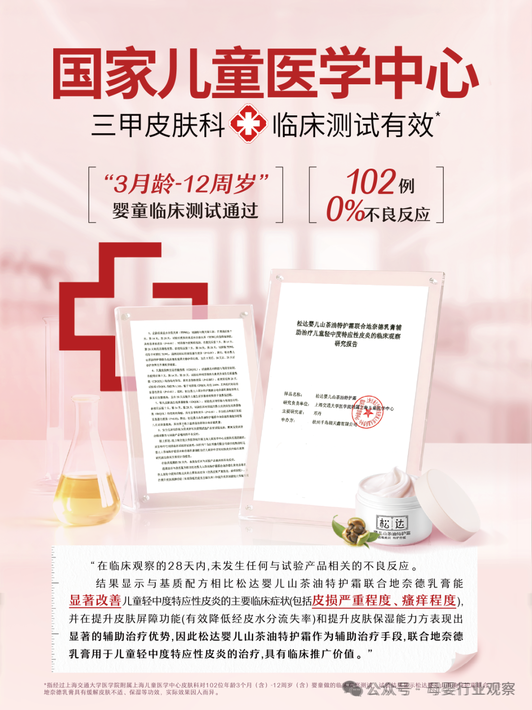 而松达对安心特护的坚守也得到权威医学研究机构的验证——松达婴儿山茶油特护霜通过松达与上海交通大学医学院附属上海儿童医学中心皮肤科合作展开的辅助治疗临床观察试验。更具行业标杆意义的是,目前此项临观实验已通过评价标准更严苛的、涉及婴幼儿及儿童的临床试验伦理审查批准,不仅102例临床试用均无不良反应,更验证了松达山茶油特护霜在改善婴幼儿及儿童皮肤不适方面的四大显著功效优势。
